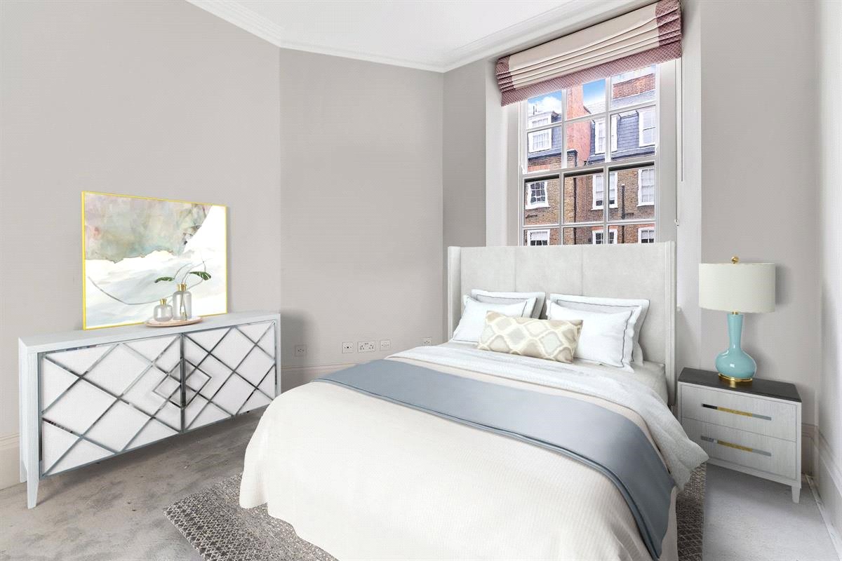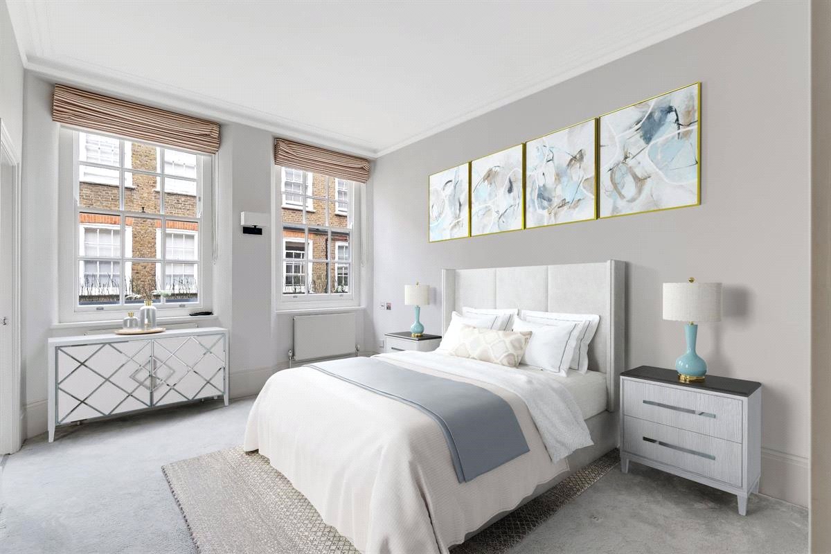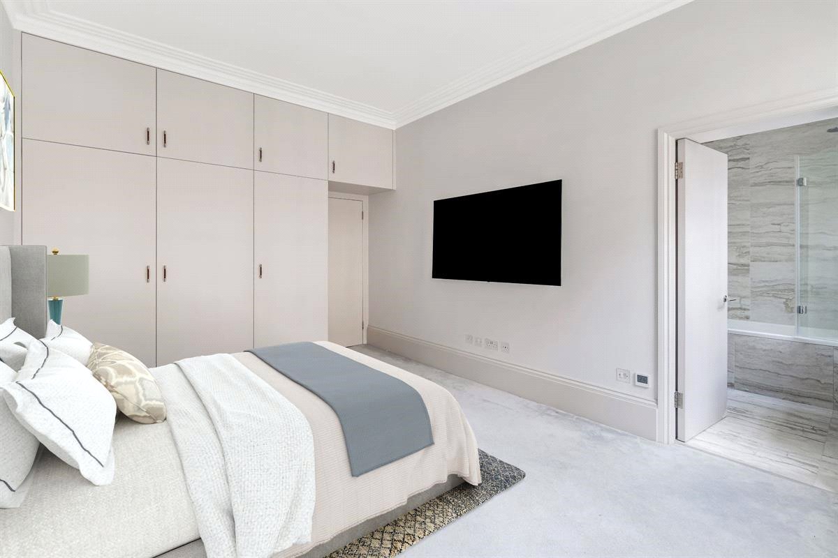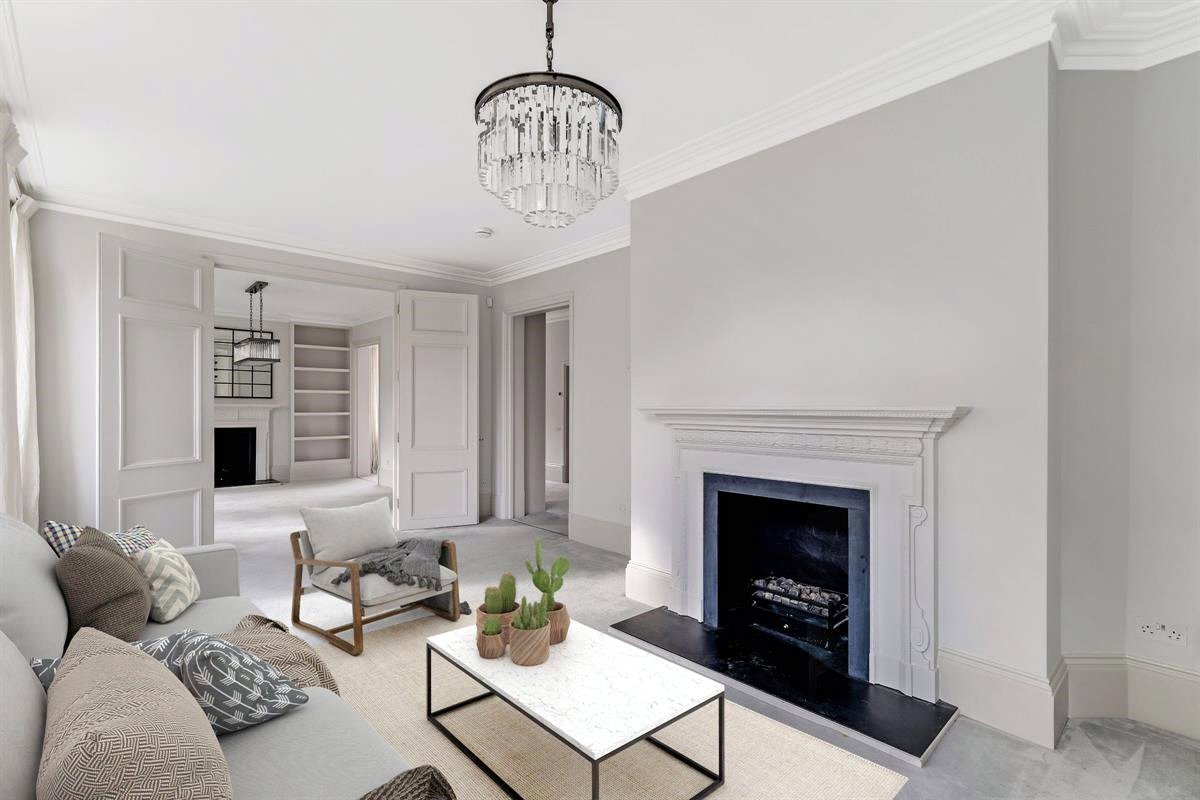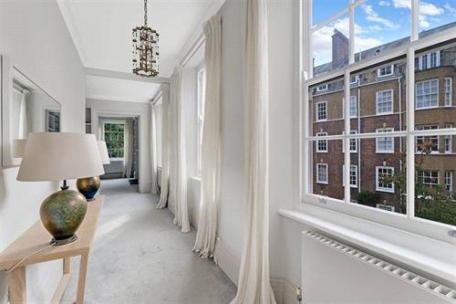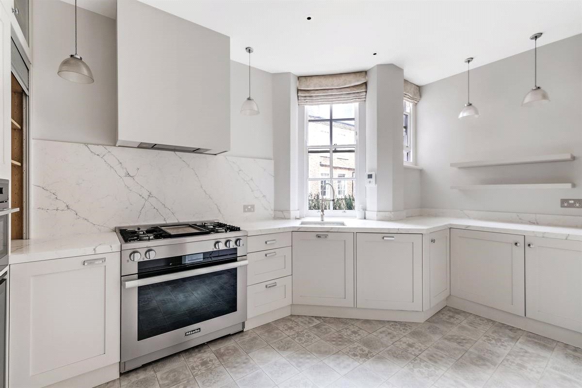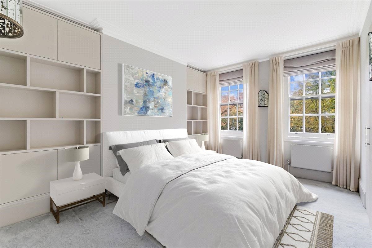 This peaceful apartment on the second floor offers sweeping views of the serene communal gardens. It comprises a spacious double reception room with tall ceilings, period features and garden views, and a separate kitchen equipped with Miele appliances, including a wine cooler. The master bedroom has built in storage and en-suite, there are three further bedrooms, two serviced by a Jack and Jill bathroom, the fourth by a shower room.